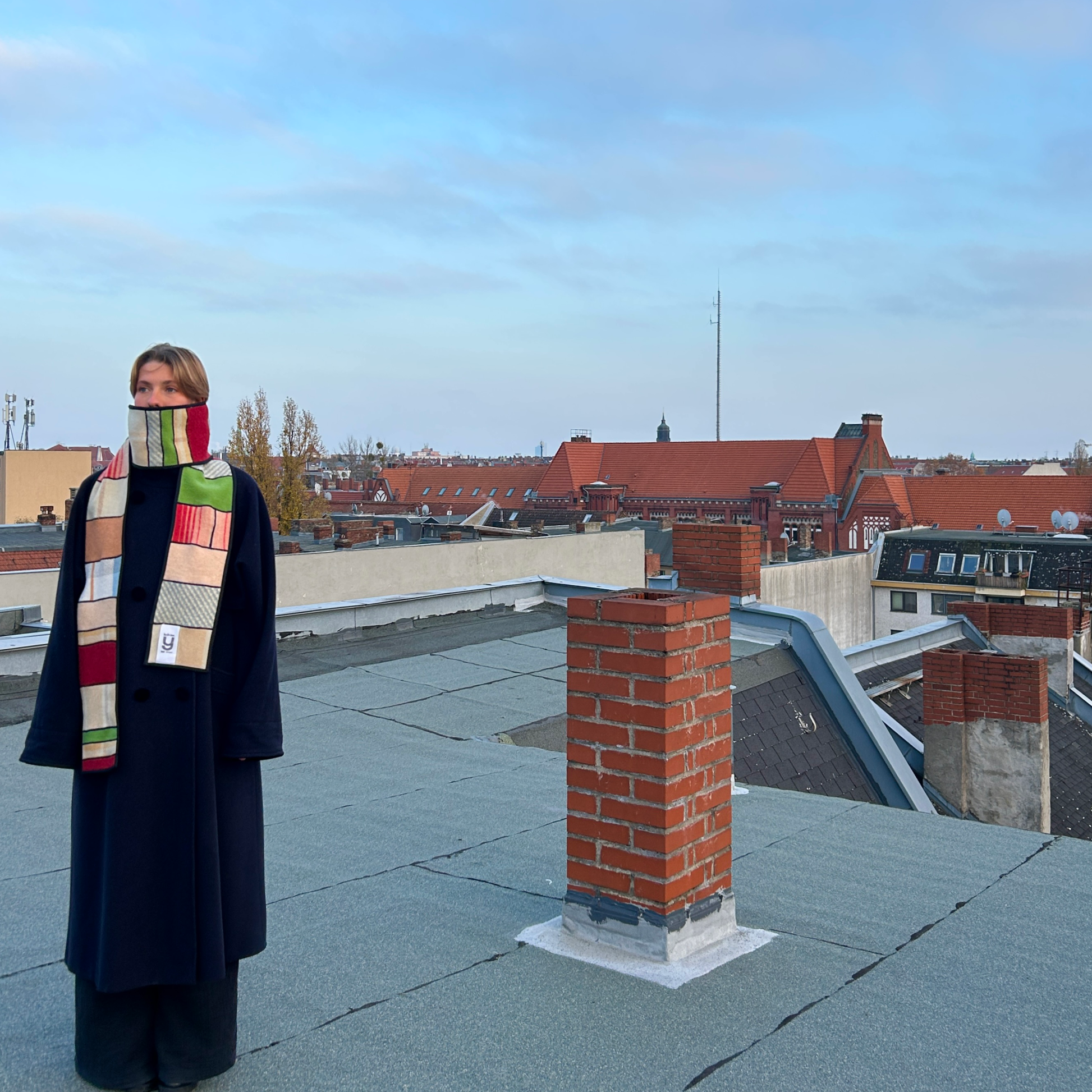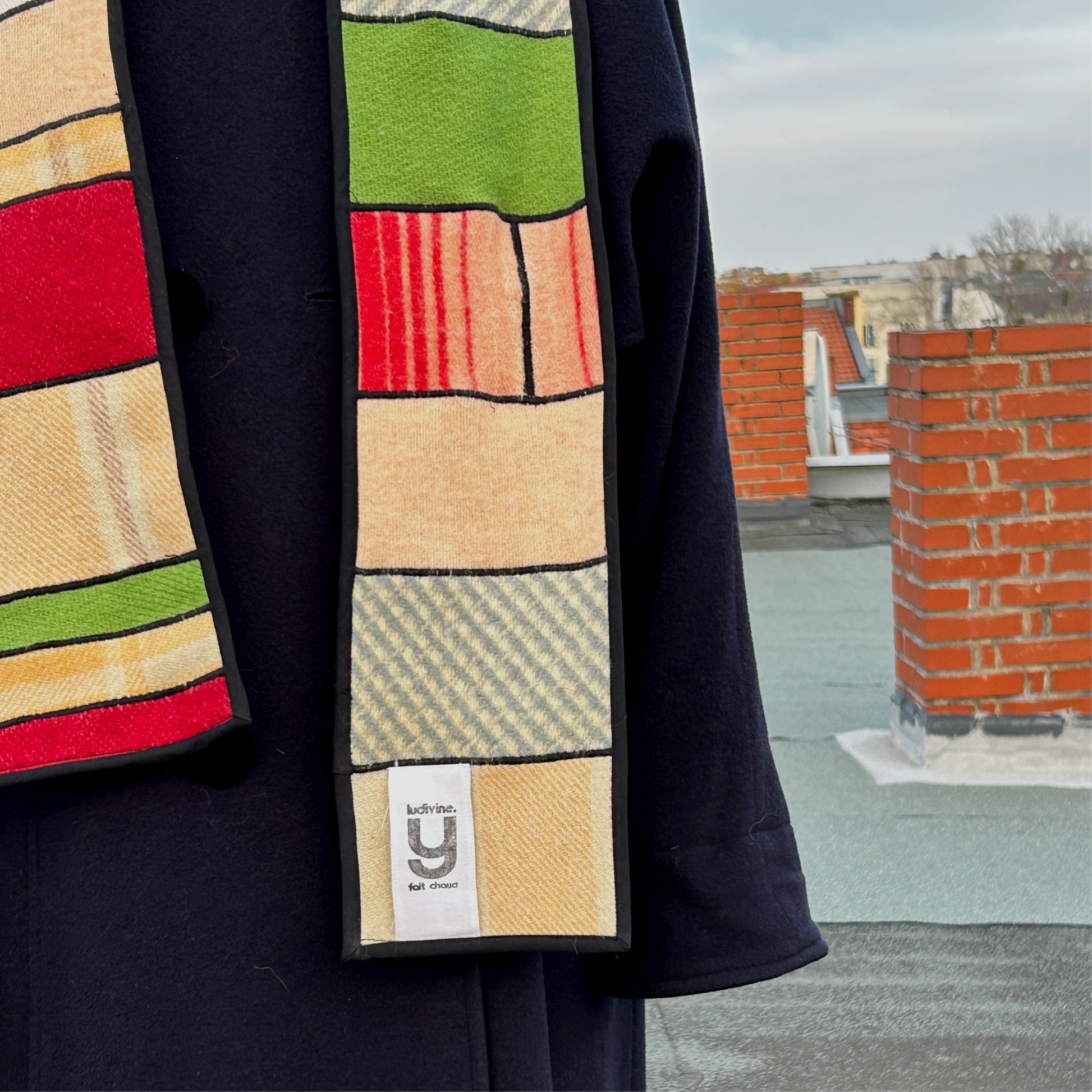 Cette écharpe est un patchwork réalisée à partir des chutes de tissus des manteaux-pulls.